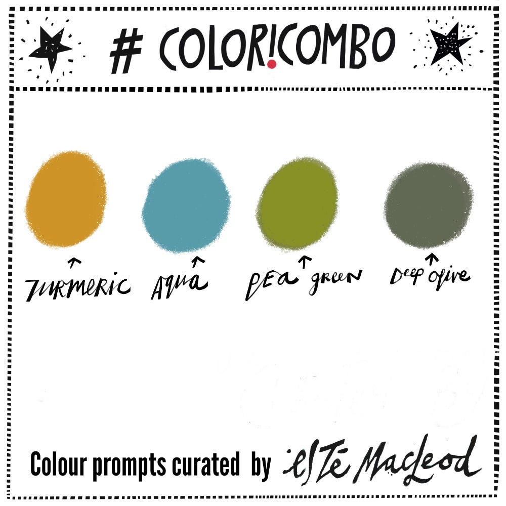 The chosen colours are Turmeric, Aqua, Pea Green & Deep Olive. Use them together with neutral lights and darks to create an artwork in any medium or style.