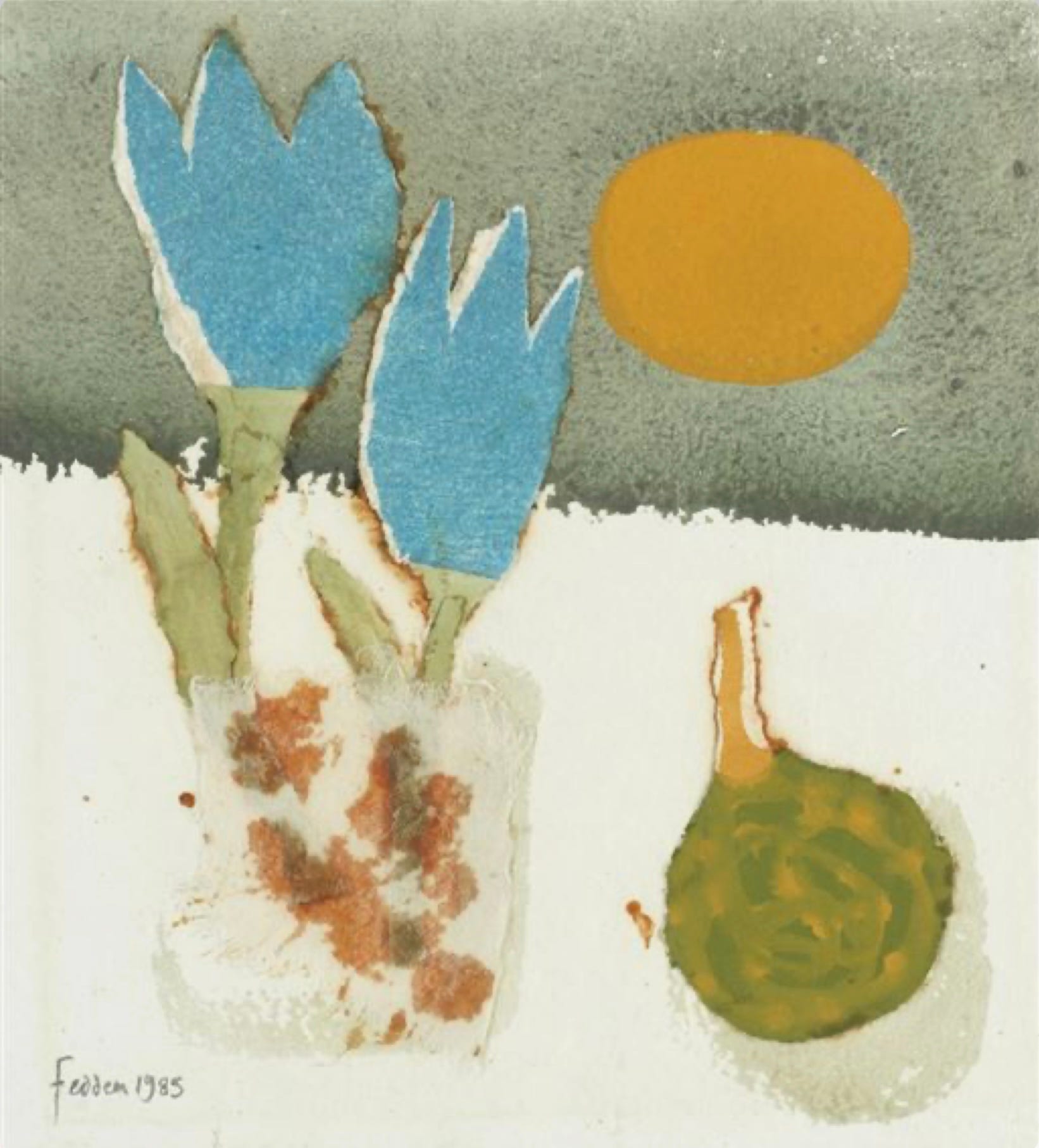 The artwork featured is by a British artist who had a long and prolific career. Mary Fedden (1915–2012) was known for her vibrant still-life paintings and lyrical landscapes. Born in Bristol, she studied at the Slade School of Fine Art in London from 1932 to 1936. After graduating, she worked as a professional painter and muralist, before serving in the Women's Land Army and later as a stage set designer for the Navy, Army and Air Force Institutes during the Second World War.