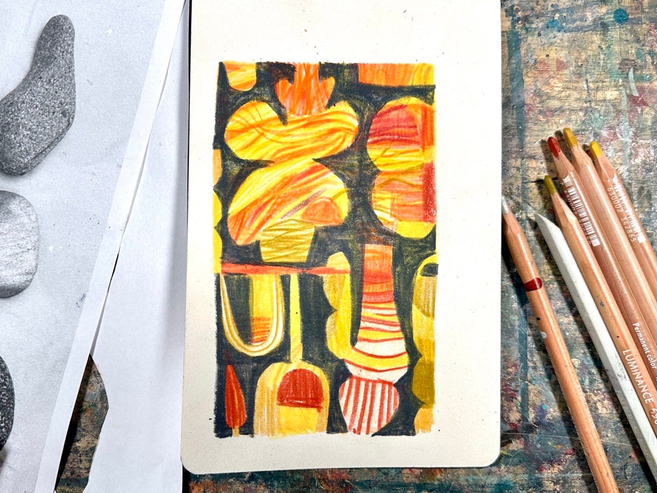 I start small and simple with colours and marks drawn in a square, using a sheet of pebble shapes from a previous Coloricombo post as template. This is a way to let go of planning and having to know what the outcome will be. This creative process also allows one to stop and to continue at a later stage. In the demo I show how the lines became layers of blended colours and I ended up with a layered abstract drawing of bulbous orange shapes on a grey background