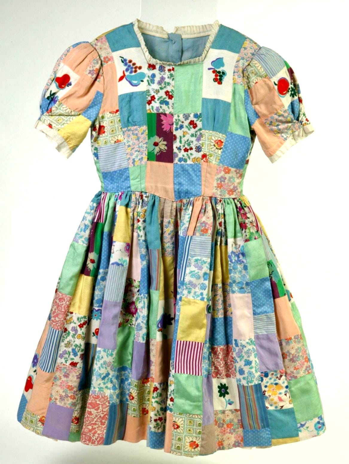 Jane Pearce could not have imagined back in 1944 that her emergency handmade patchwork dress would end up in the Victoria & Albert Museum sixty years later. The story goes that four year old Jane got invited on short notice to a party that she really wanted to go to, but had outgrown her party dress.