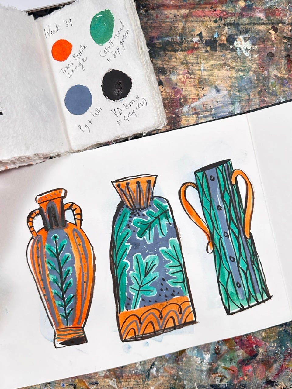This colour combination is quite unusual but I ended up pleased with the three vases I painted in my sketchbook. Full subscribers can watch a demonstration below.