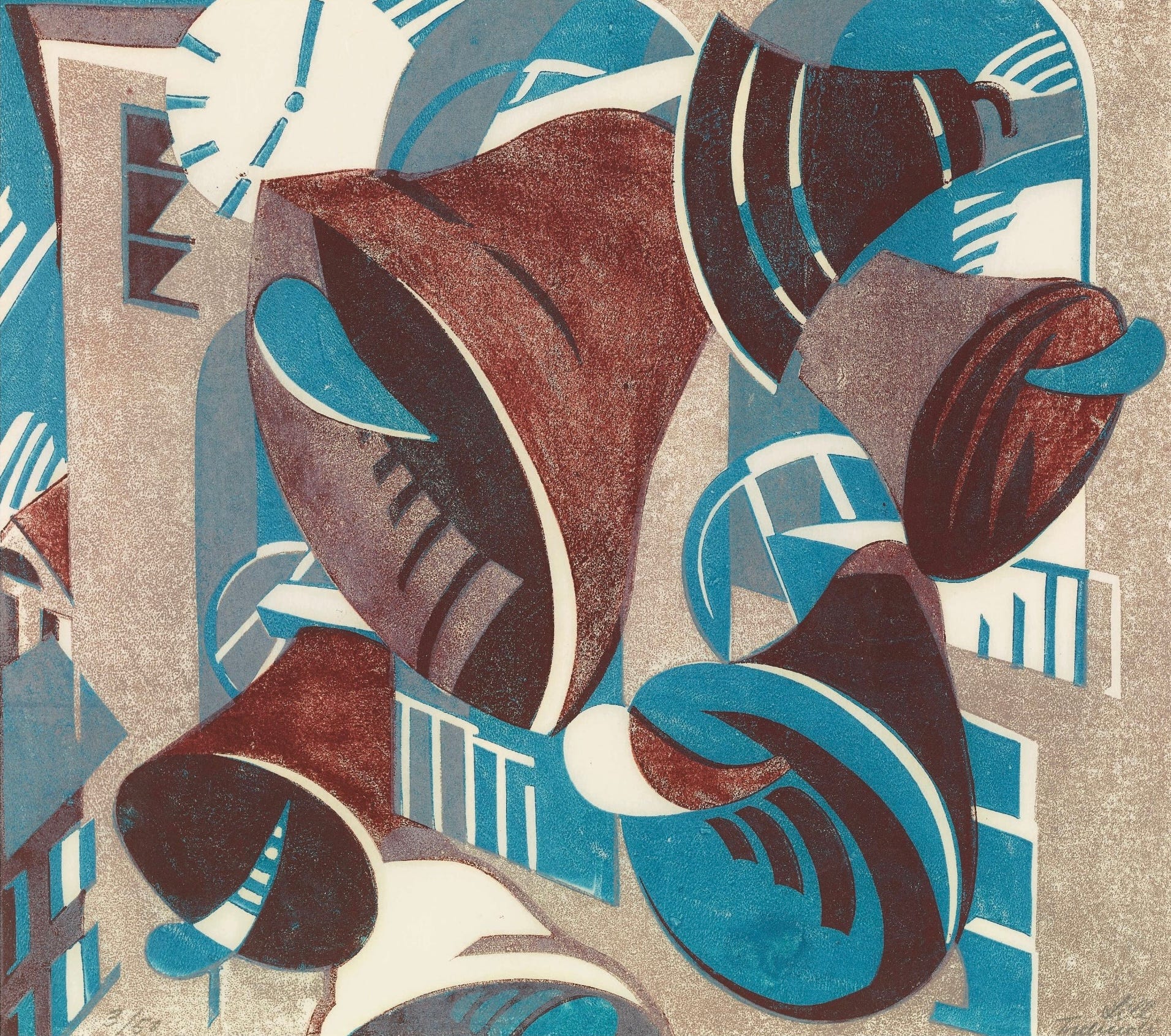 “Bells”, coloured linocut print, Lill Tschudi, 1937