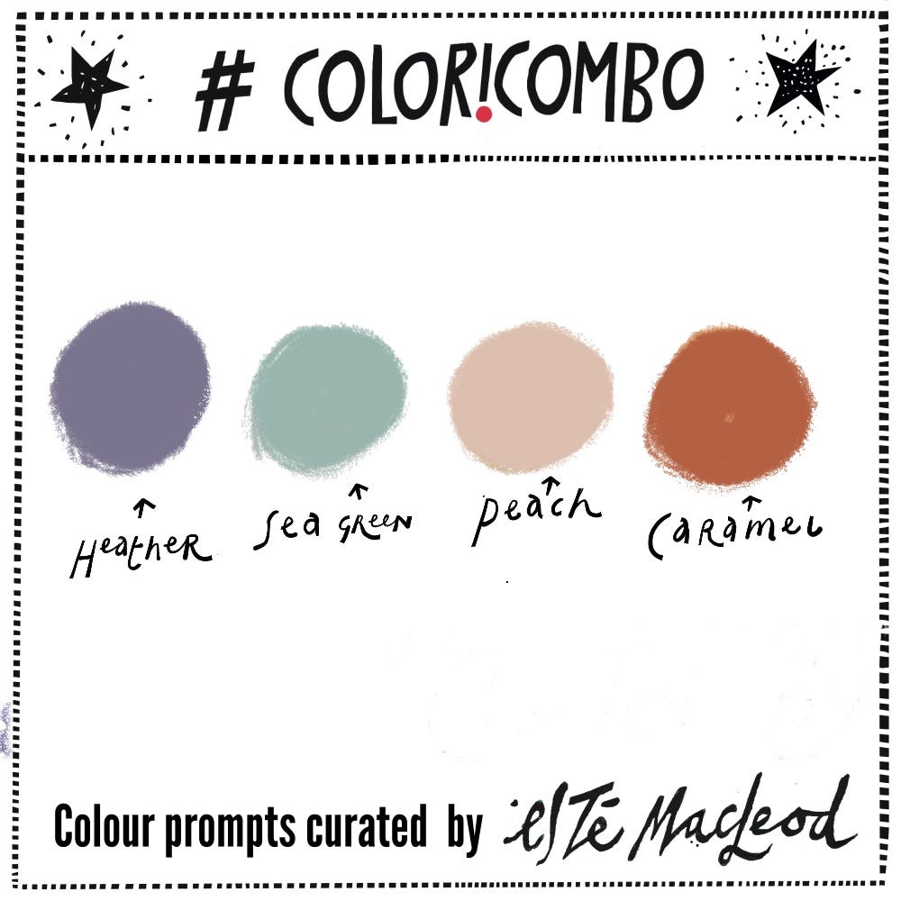 The colours this week are Heather, Sea Green, Peach & Caramel. Use the colours along with a contrasting dark and neutral light colour to create an artwork in any medium or style. Share this post with someone who likes colour and might enjoy a weekly dollop of colour and creativity.