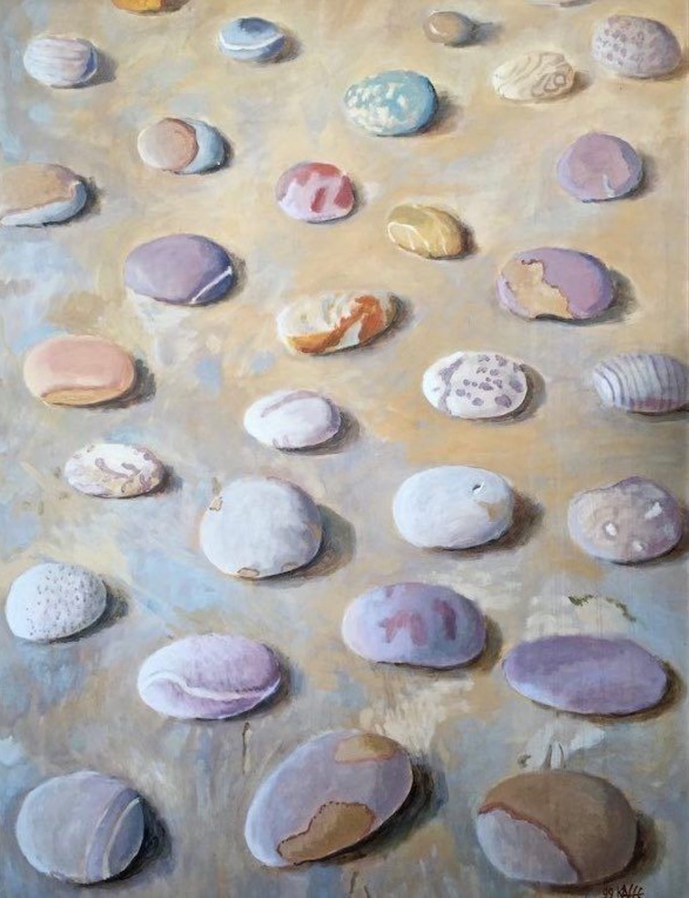 I’m in awe of Fassett and am sharing one of his paintings with you. You’ll know by now that I love to use pebbles as inspiration, so this painting with softer pastel colours appealed to me. Have a look at more of his paintings on his website.