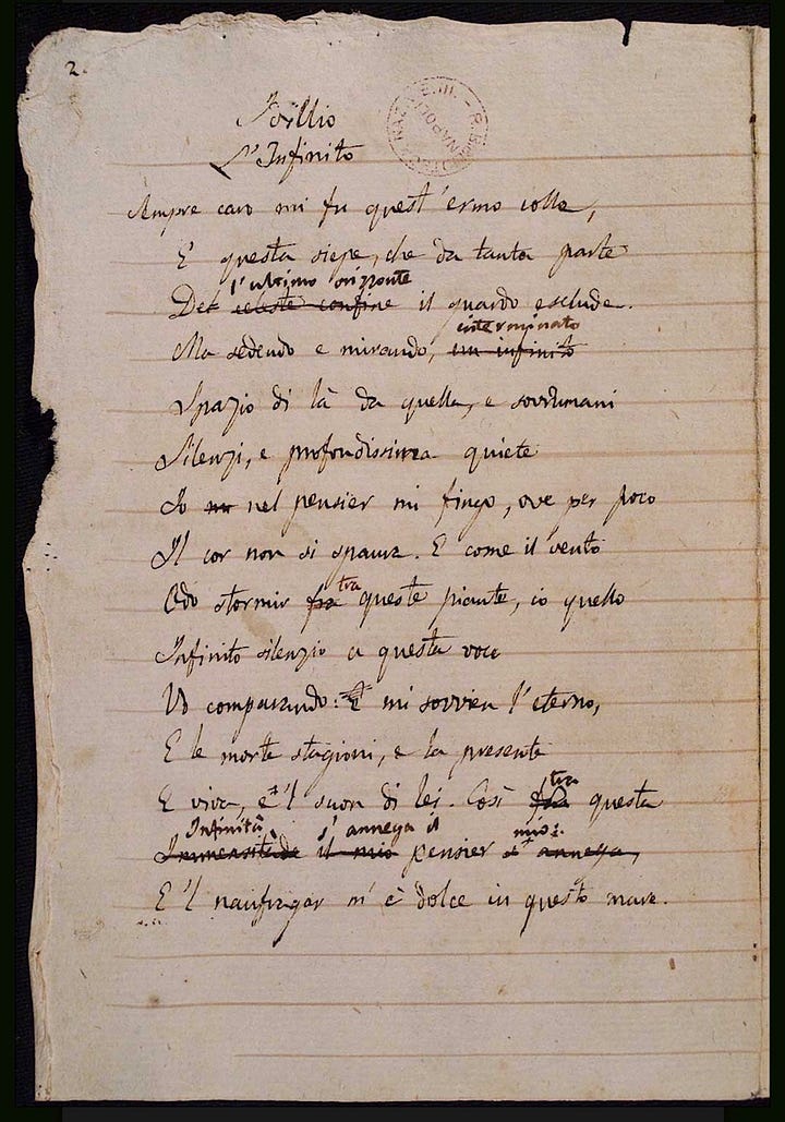 In 1816 something changed and Leopardi stopped doing scholarly work completely and started writing poetry - he phrased it as the passage from erudition to the beautiful. He started with poetry deeply influenced by classical forms before developing the style he’d become known for: lyrical poetry exploring nature, memory, childhood and unrequited love. L’infinito written in 1819 describes his yearning to travel beyond the confines of Recanati and to experience more of the world which he had studied.