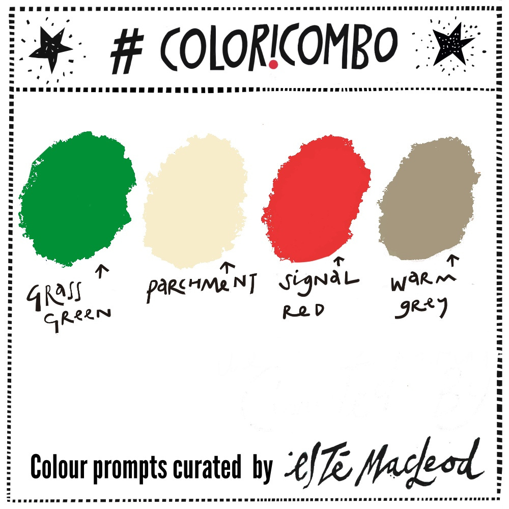 Colours this week were taken from a book cover and are Grass Green, Parchment, Signal Red and Warm Grey. Use them along with a contrasting dark and neutral light colour to create an artwork in any medium or style. Know someone who might enjoy a weekly dollop of colour and creativity? Why not share this post with them?
