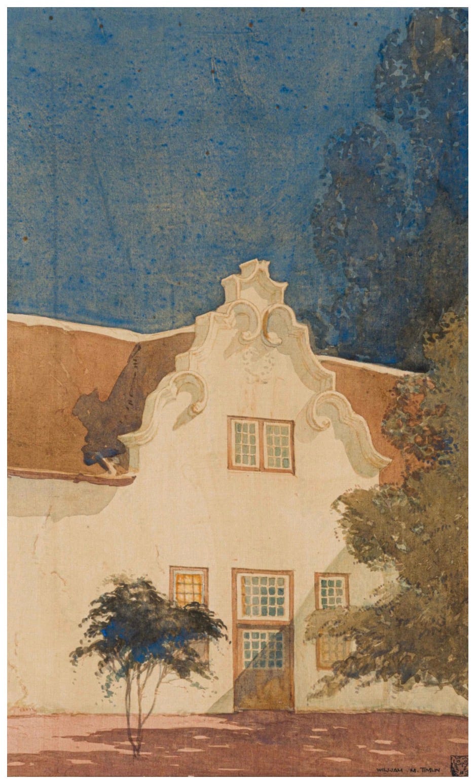 “Cape Dutch Building (Spier, Stellenbosch)”, watercolour on silk laid on board, William Mitcheson Timlin, date unknown