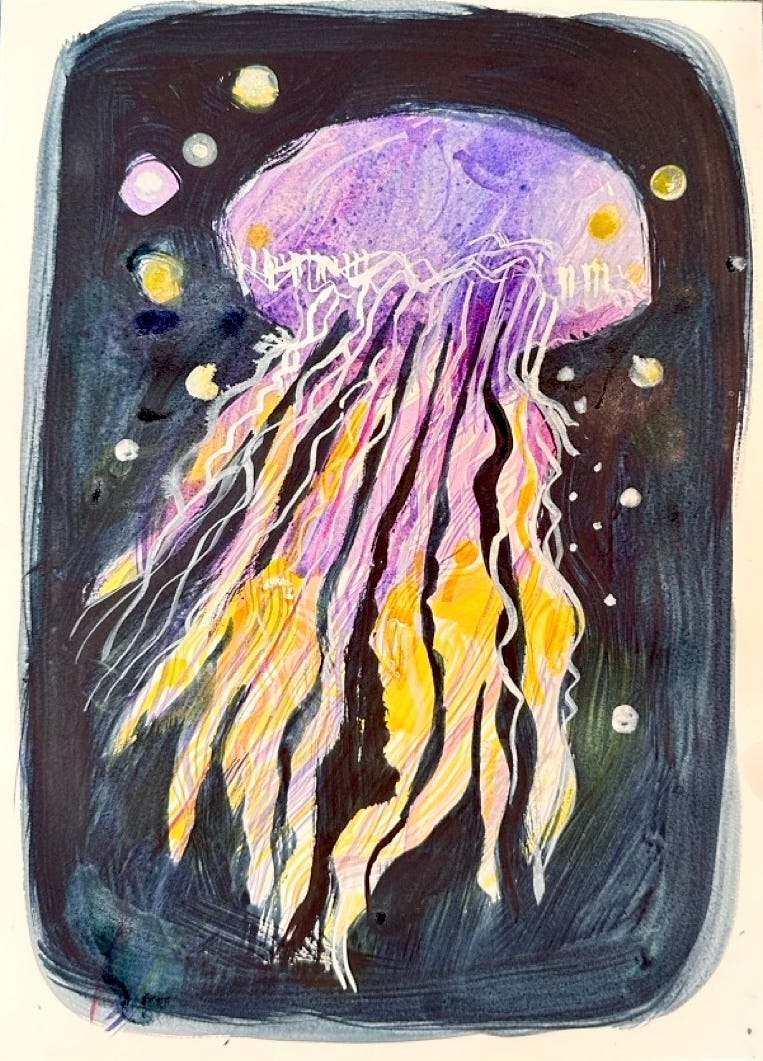 In the demo, I’m showing a way to create a negative shape around textures. The purple and yellows colours I mixed are used to paint the watery textures of the jellyfish first, using a fan, comber and a dagger brush. A jellyfish cardboard cutout was then used to create the negative space - the dark painted area around the jellyfish. The video is recorded in real time, not edited much, and about 15 minutes long.