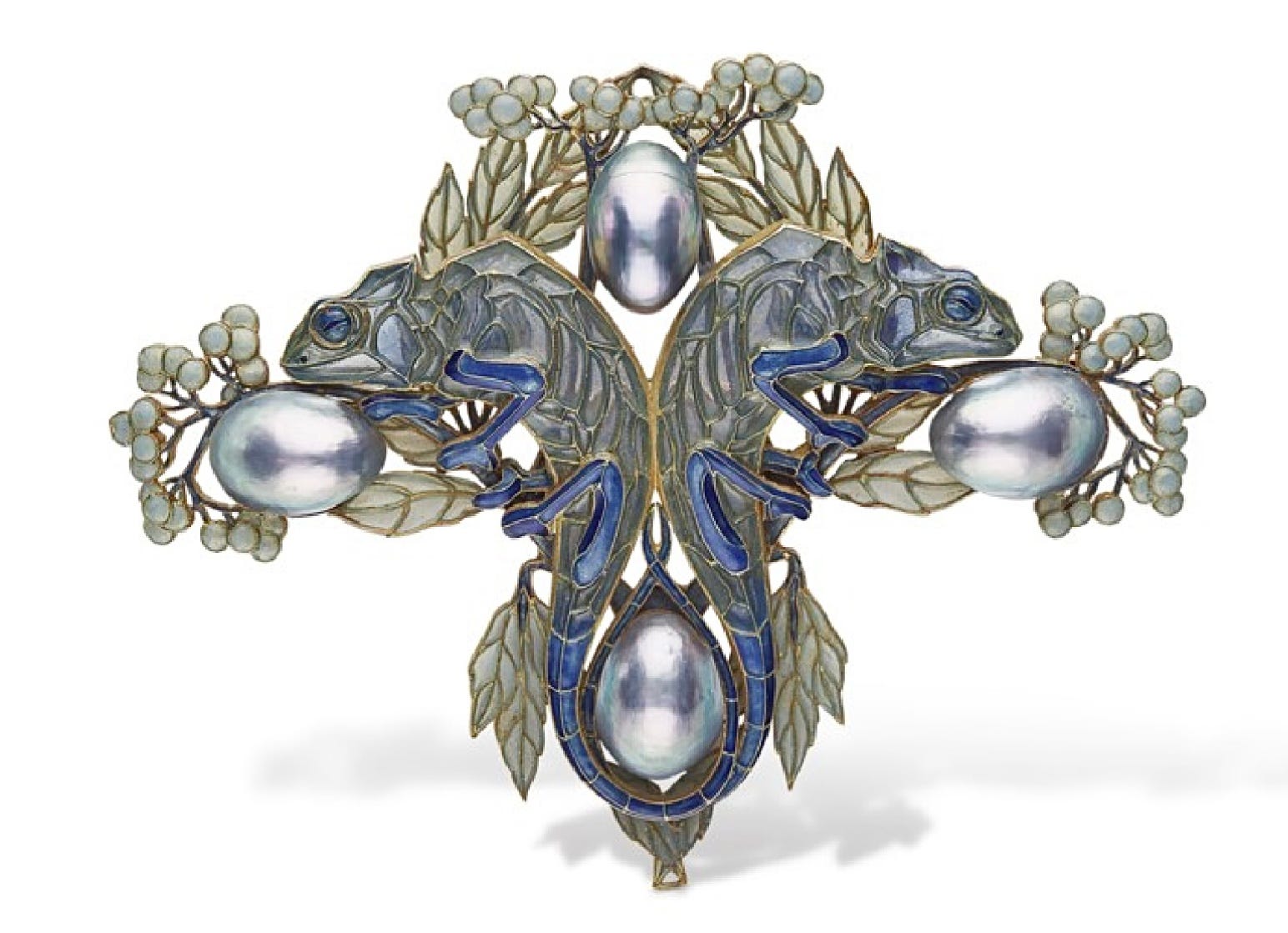 “Cameléons”, mother-of-pearl, blue enamel and gold, René Lalique, ~ 1900
