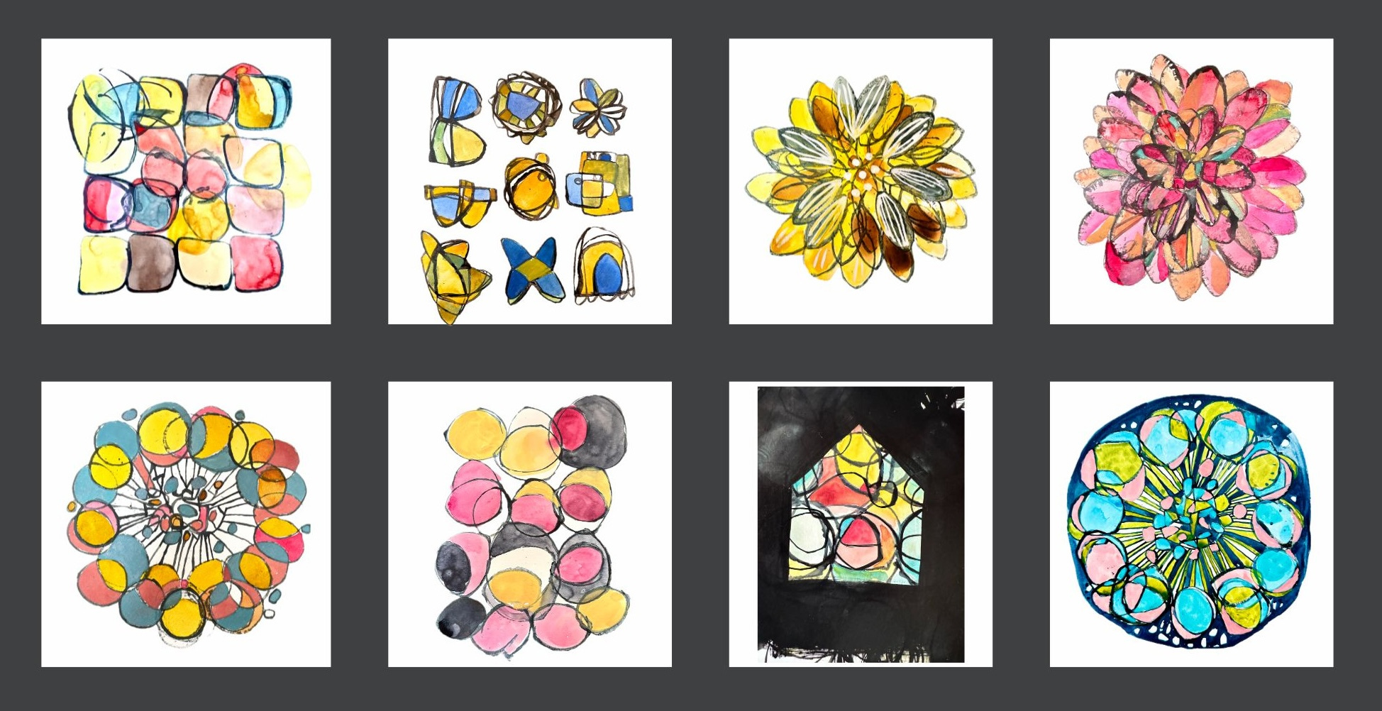 In the live session I demonstrated different ways to used cardboard tubes to stamp shapes and loopy patterns. The printed outcomes can be used as templates to be filled with combinations of colours and is a great way to incorporate the weekly #coloricombo prompts. In the session I mixed some paint combinations using watercolour and painted them on the stamped sheets (see the image above).