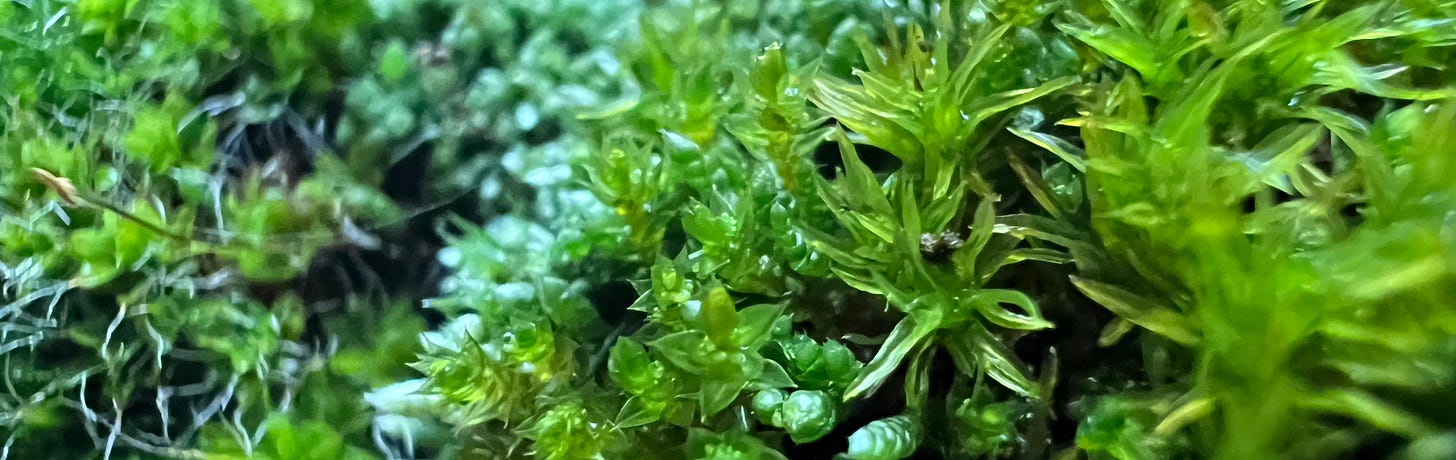 Moss grows where nothing else can grow. It grows on bricks. It grows on tree bark and roofing slate. It grows in the Arctic Circle and in the balmiest tropics; it also grows on the fur of sloths, on the backs of snails, on decaying human bones. ... It is a resurrection engine. A single clump of mosses can lie dormant and dry for forty years at a stretch, and then vault back again into life with a mere soaking of water.