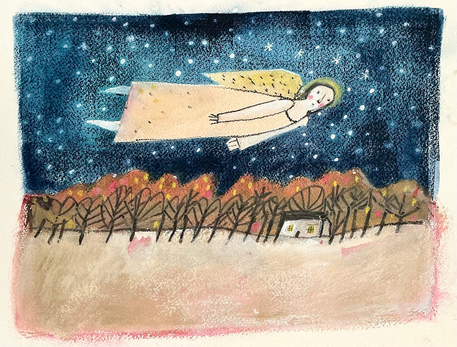 Masking fluid was used to create the highlights for the stars. In this demo I use Inktense pencils to draw in detail, and blocks for added colour. The painting is done on Arches Cold Press watercolour paper.
