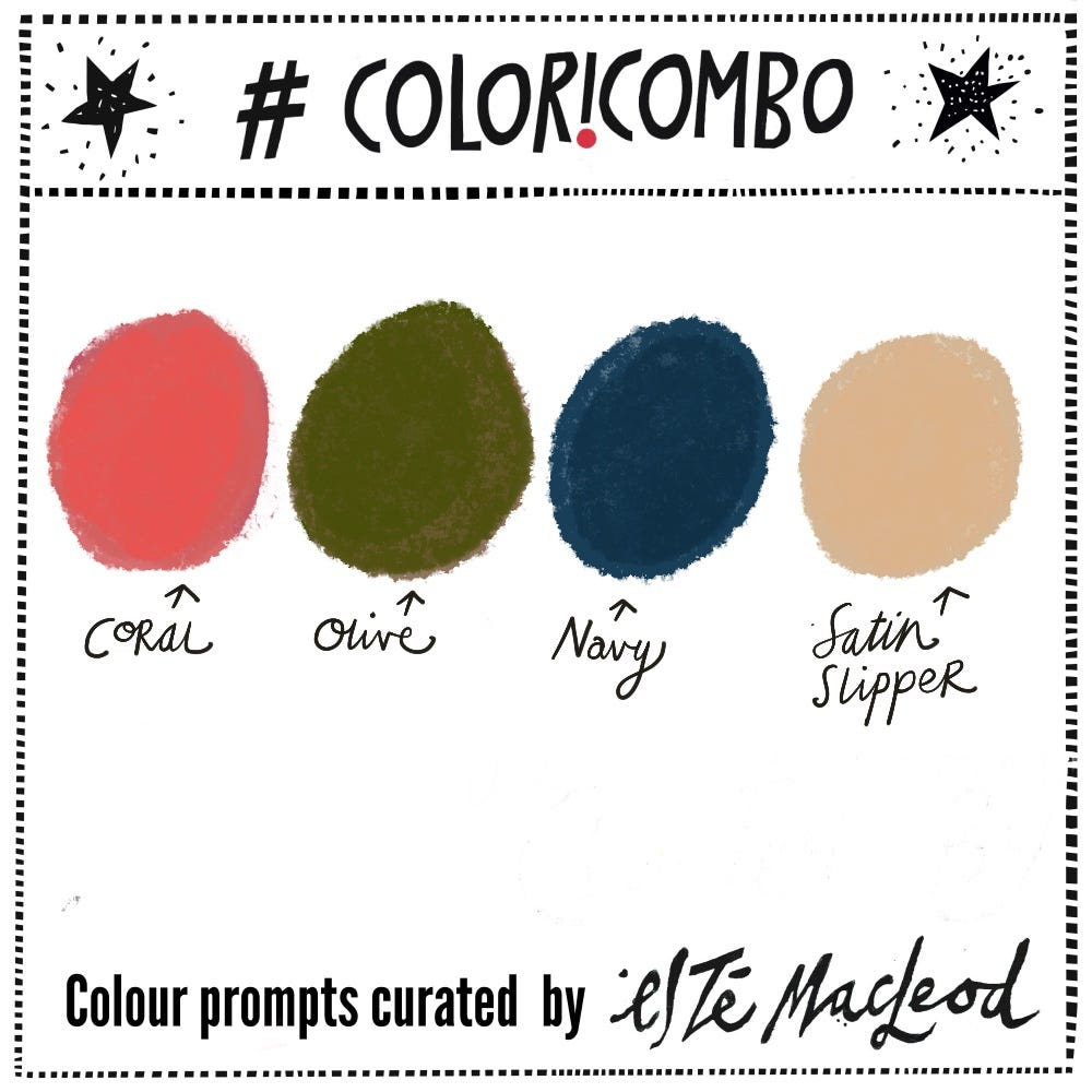 Week 51's colours are Coral, Olive, Navy & Satin Slipper