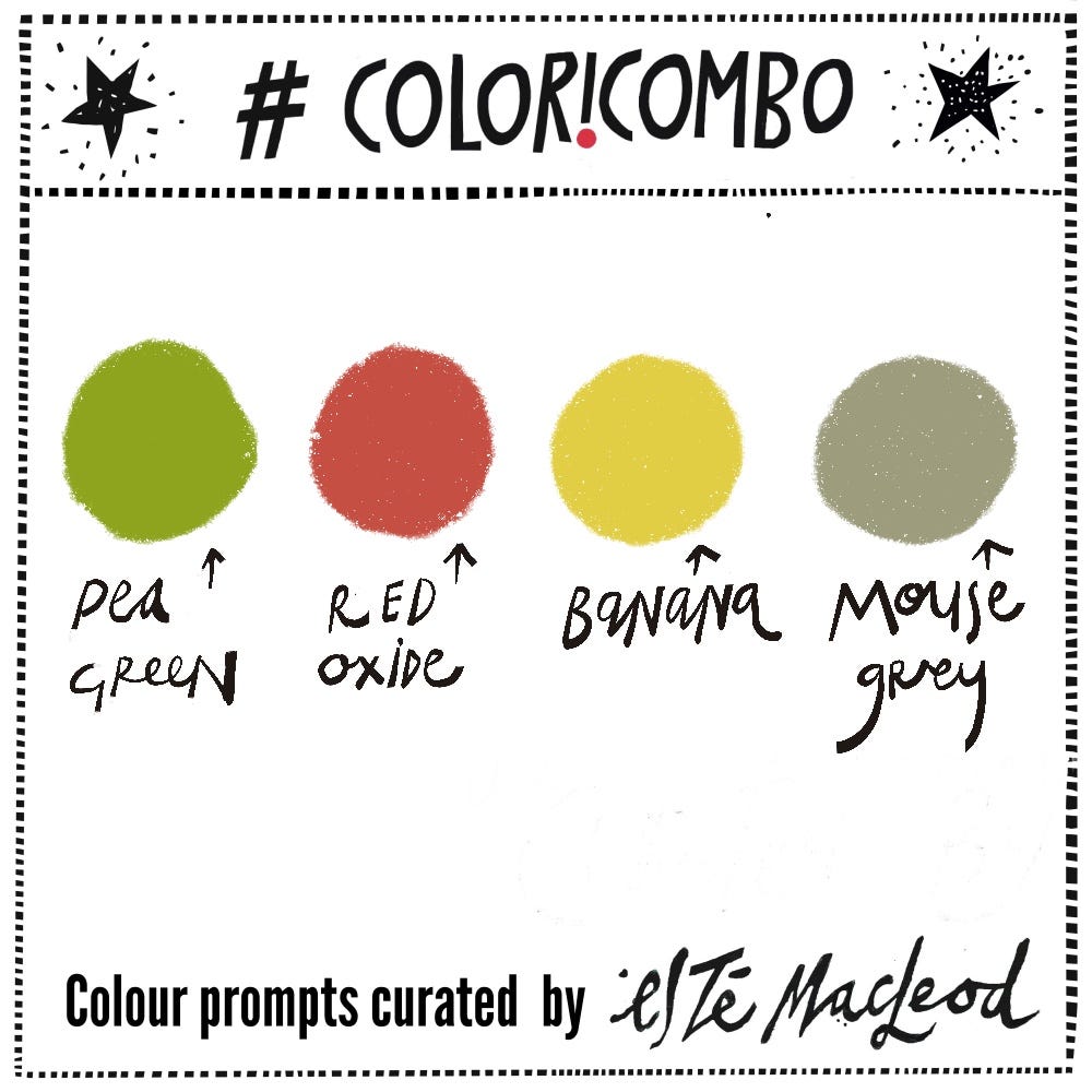 The chosen colours this week are Pea Green, Red Oxide, Banana & Mouse Grey. Use the colours along with a contrasting dark and neutral light colour if you wish. Create an artwork in any medium or style.
