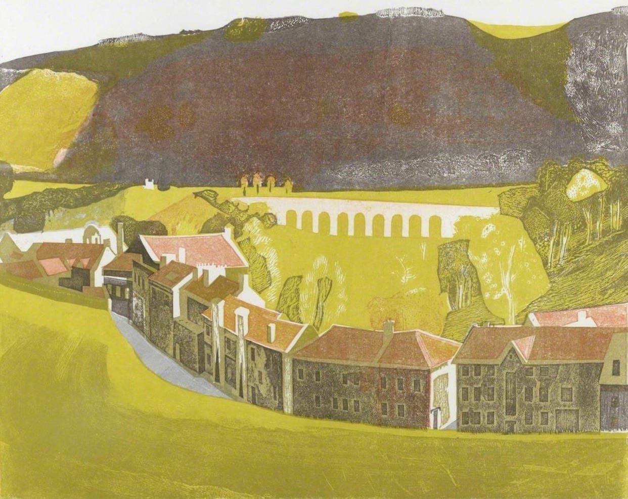 “Monkton Combe, Somerset’, coloured linocut and card print, Sheila Robinson, 1964 (© Estate of Sheila Robinson)