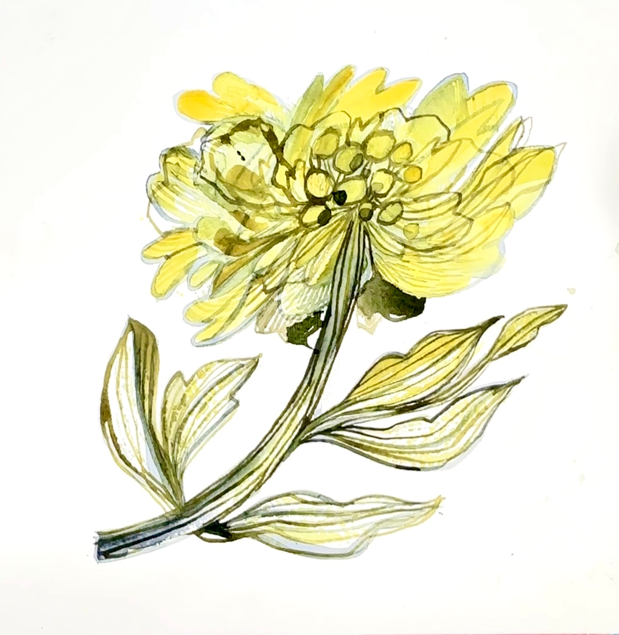 ‘Yellow Peony” Watercolour and ink drawing, Este MacLeod, 2025 (video demonstration below)