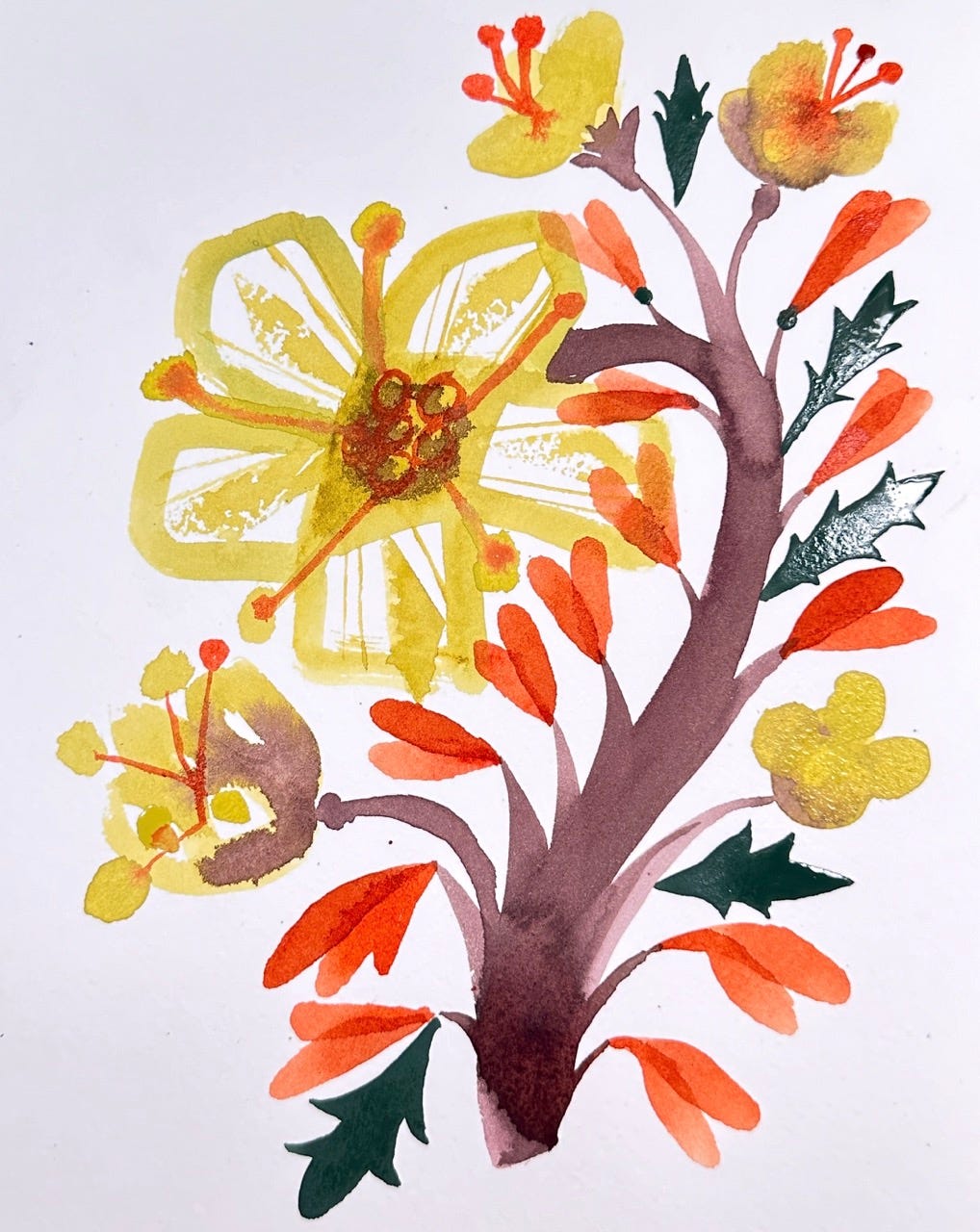 I used this week’s colour mixes to put together a quick floral artwork using brushes and stamping.