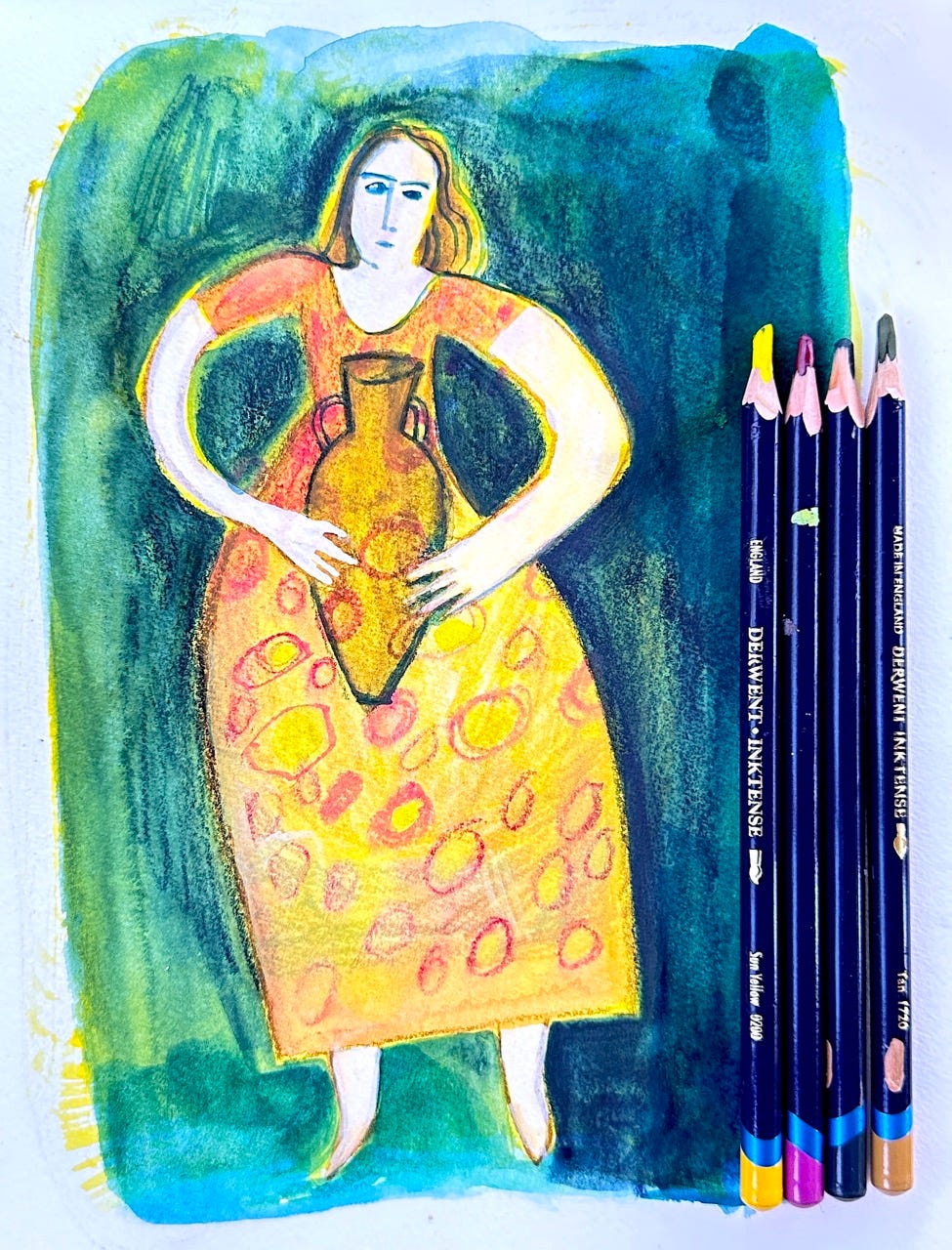 Here’s this week’s outcome, where I started using the colours to create a vase that morphed into a woman carrying a Greek amphora-like vase. I created this drawing with Derwent Inktense pencils and Golden QoR watercolours on a Hahnemühle watercolour sketchbook.
