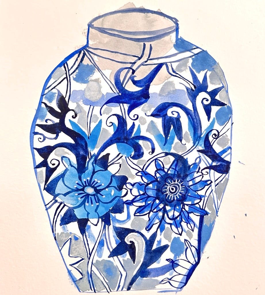 The marks I made on a watercolour paper during the mixing demo were turned into a Delftware-inspired vase.
