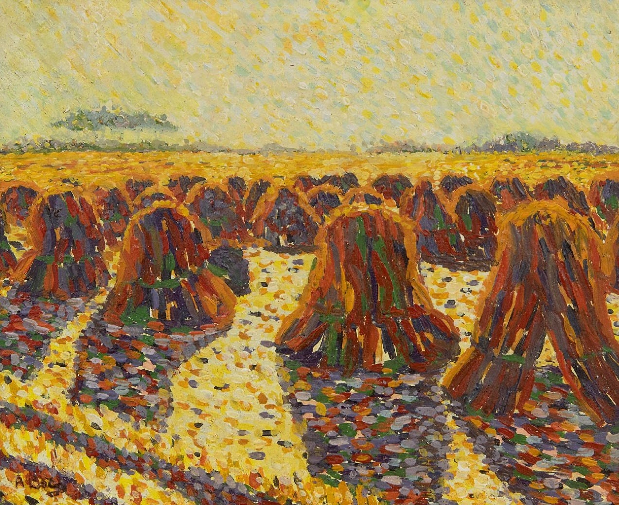 “Wheat Sheaves in a Summer Landscape”, oil on panel, Anna Boch, date unknown
