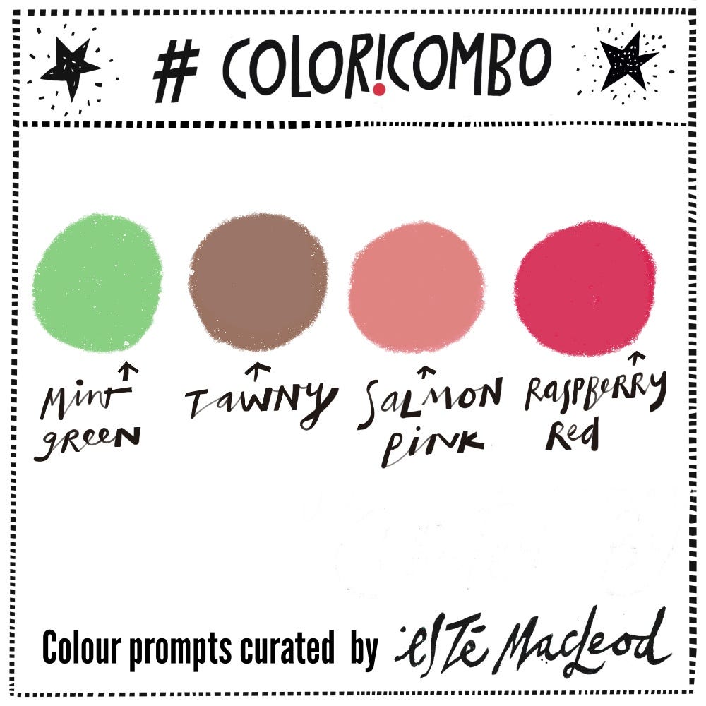 The chosen colours this week are Mint Green, Tawny, Salmon Pink & Raspberry Pink. Use the colours along with a contrasting dark and neutral light colour if you wish. Create an artwork in any medium or style.
